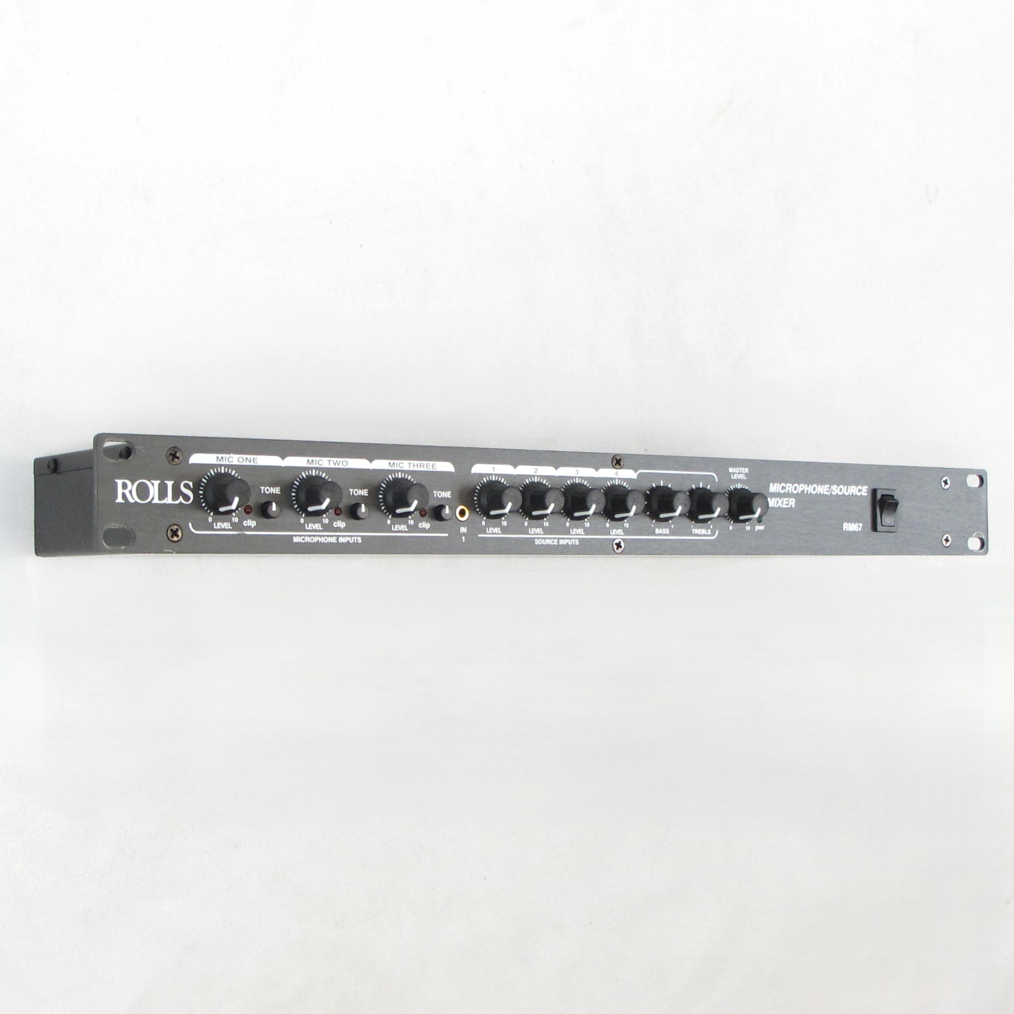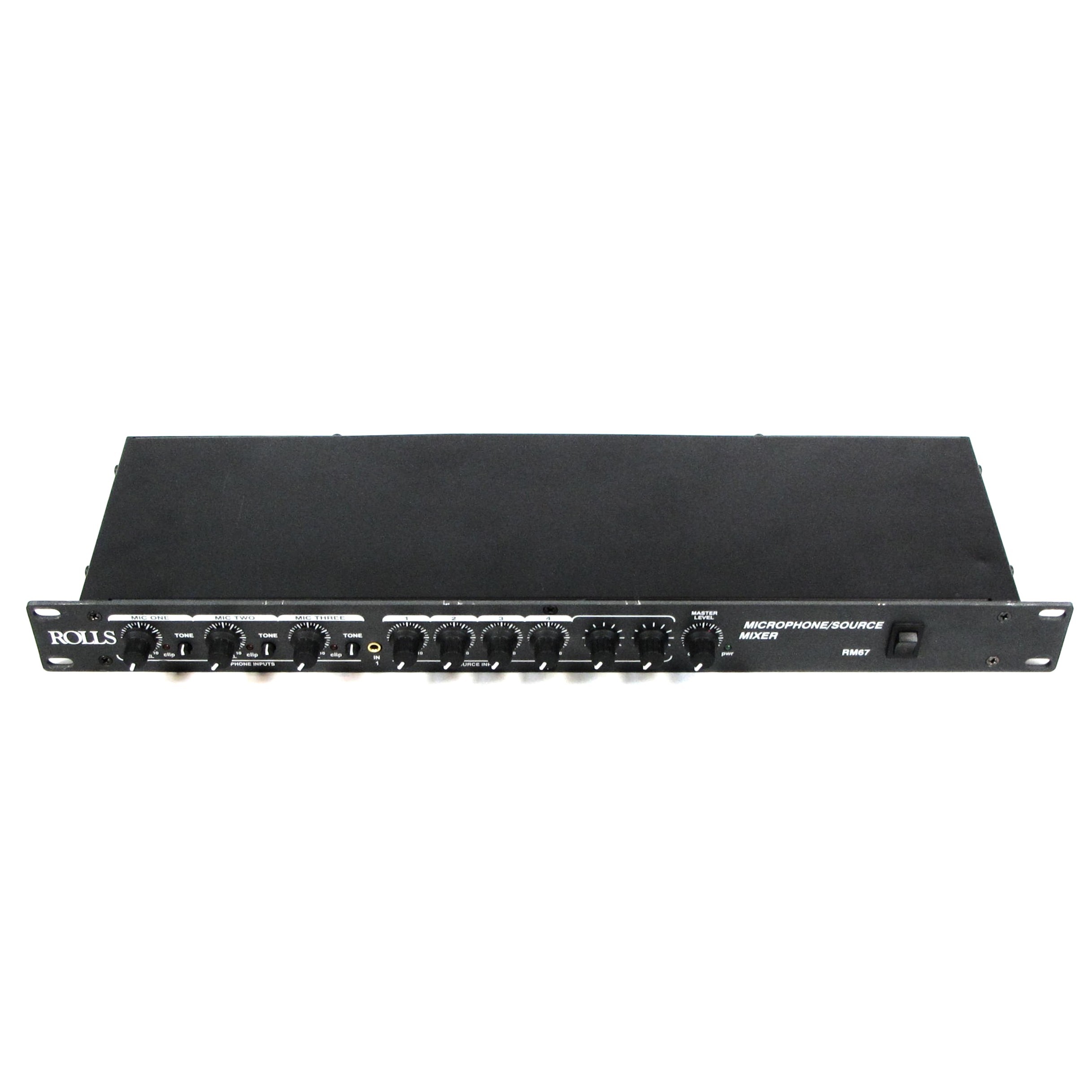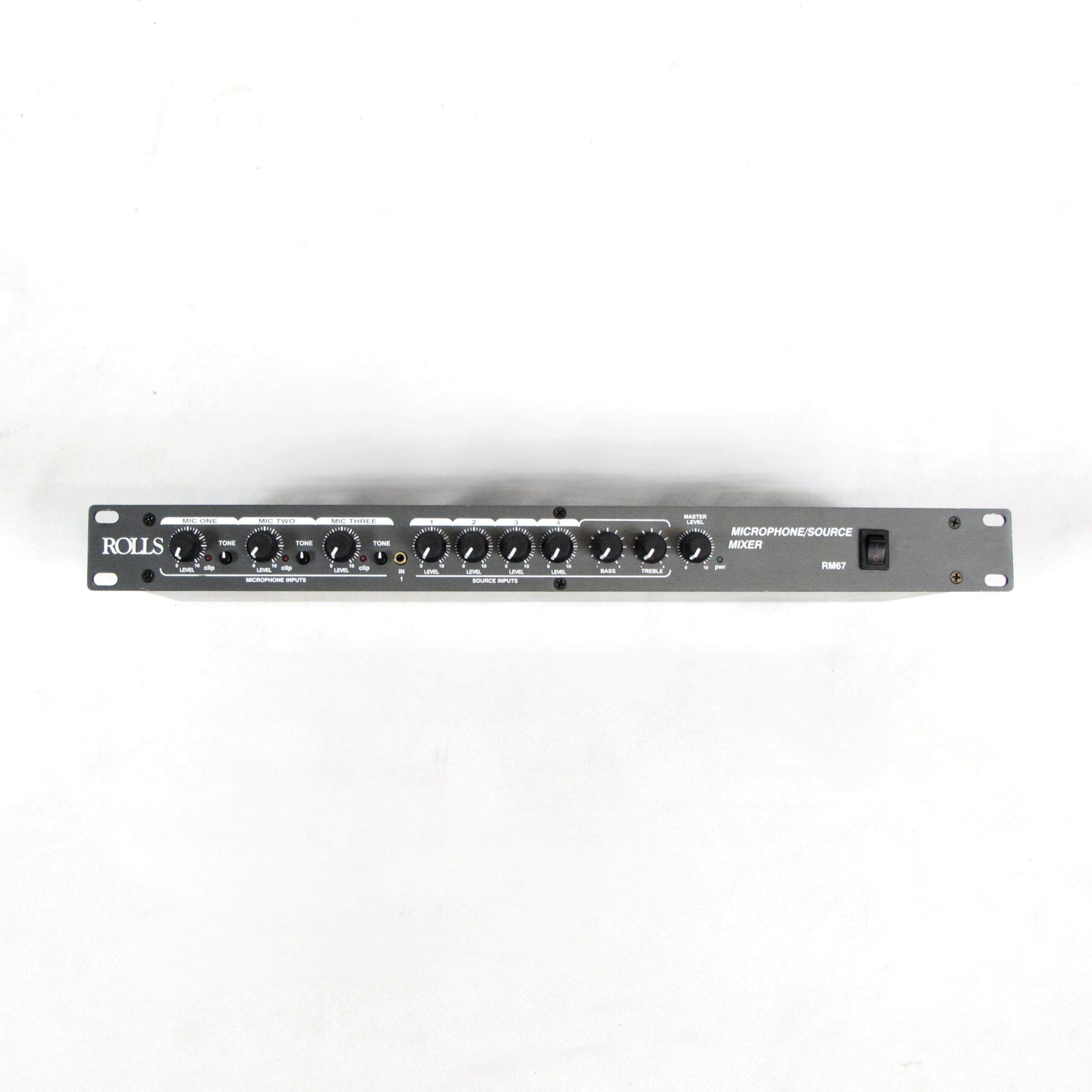 The Rolls RM67 Mic/Source Mixer is a single rack space mixer designed for the install/contractor market. The unit mixes three balanced microphones with four stereo sources to mono or stereo balanced outputs. The XLR Microphone Inputs have Mic/Line level switches, a send/return Insert jack, and individually switchable +12 VDC phantom power. Priority talkover, with variable Duck Sensitivity is available on one microphone for paging, and on one Source input for use on a jukebox. telephone system, etc. Each Microphone input has a level and tone control, and each Source input has a level control. Bass and Treble controls have been provided for all the sources, and a Master Output Level control adjusts the level of all mixed signals. Source One has an added front-panel 3.5mm input. A pre-Master RCA output has been provided for recording, and a Remote Volume output jack is provided for connection to a 100K ohm linear taper potentiometer and used as an external master level control.